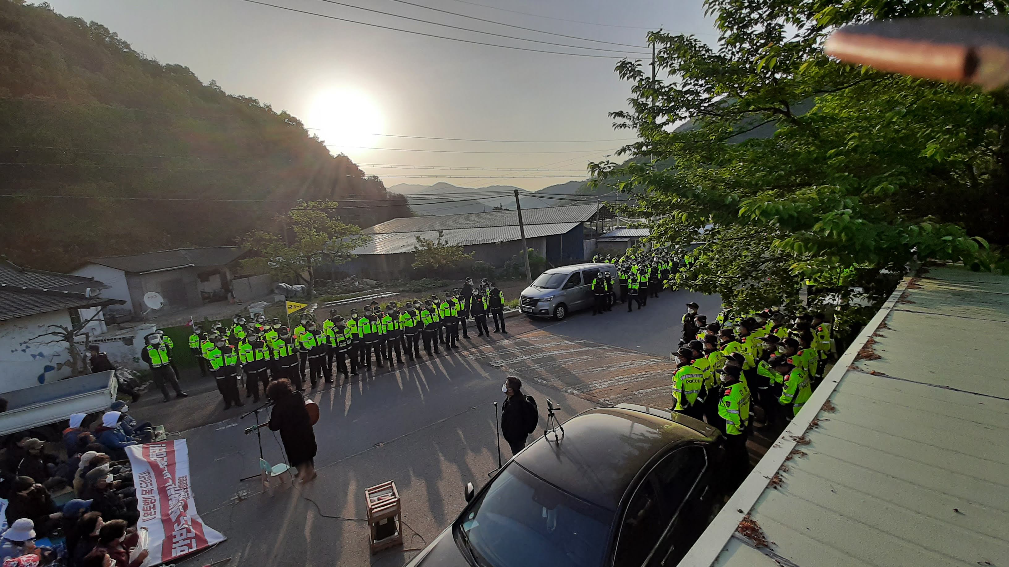 겨우 5-60명의 반대자들을 무력화시키기 위하여 얼마나 많은 경찰병력이 동원되었는지, 작전을 마치고 철수하는 경찰버스들끼리 엉켜서 마을입구 보건소 앞 삼거리는 통행이 30여분이나 막혔습니다. 응급상황을 대비해 나온 성주군보건소 요원들이 무거운 응급처치 가방을 들고 걸어나가야 했습니다.