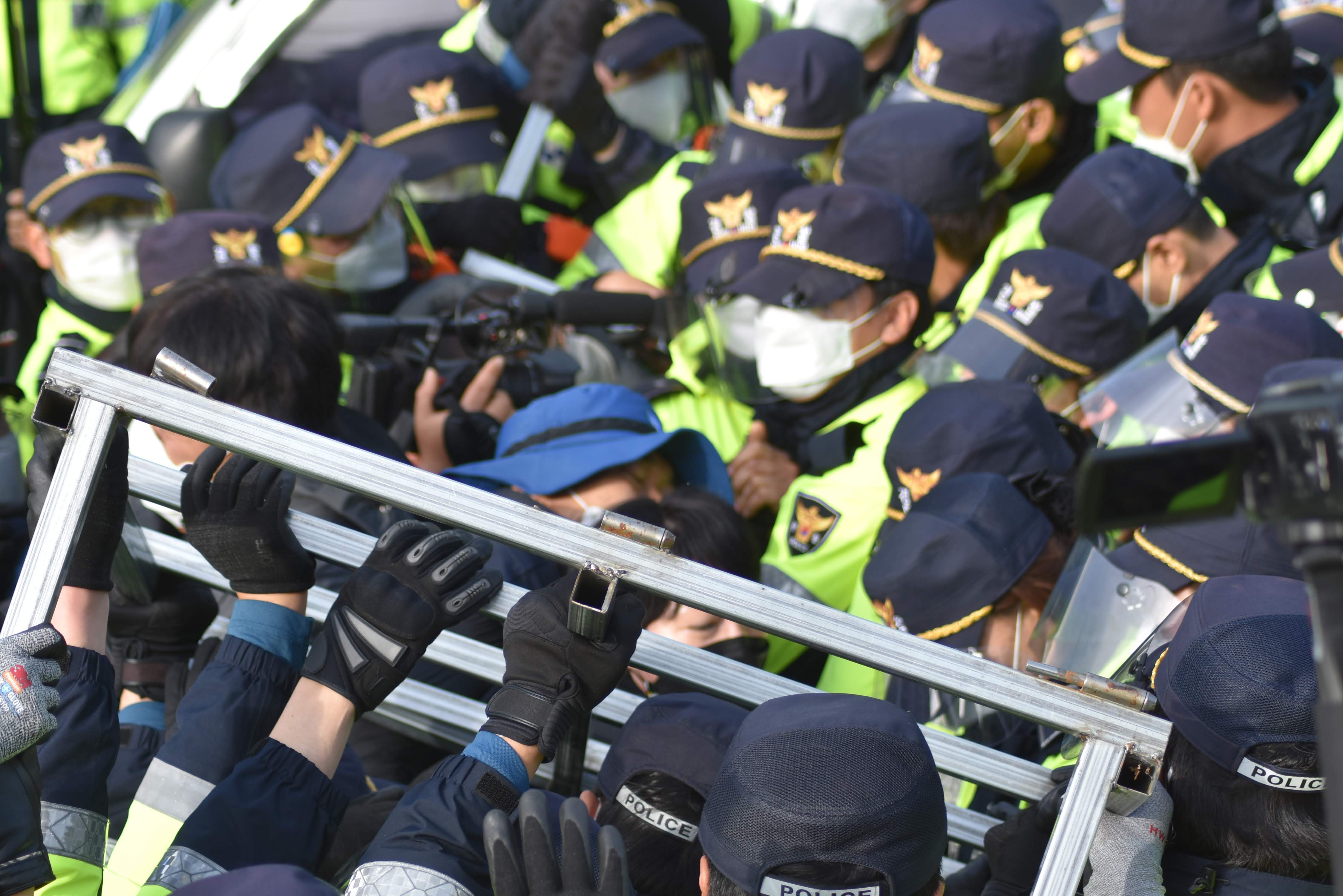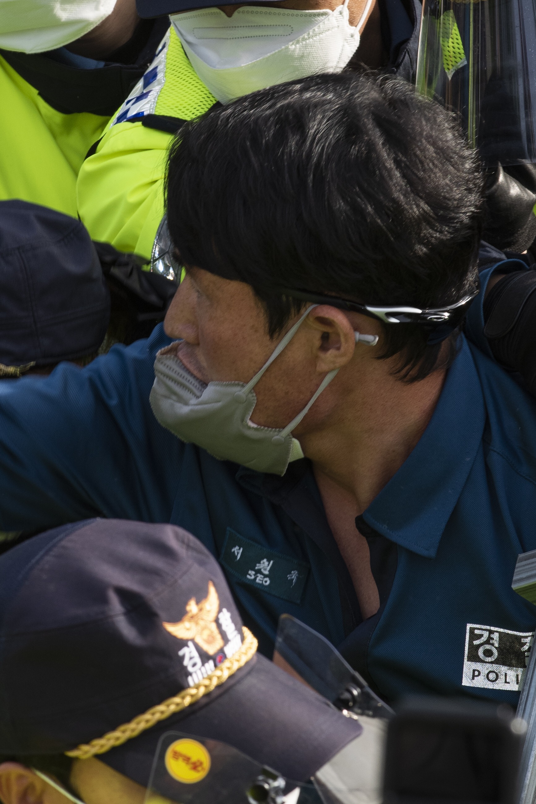 ** 이 영상은 문제의 장면을 가까이서 본 다른 분이 촬영한 것인데 현장의 소리까지 잘 들린다. 진압하는 경찰들의 목소리 "목을 잡아! 목을 잡아!", 뻗어 올린 손목을 잡아 꺾고 있는 경찰들의 손도 분명히 보인다.