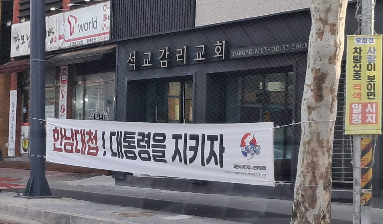 금산을 떠나기 전날 누님과 점심을 먹고 돌아오는 길 대전 석교감리교회 앞 현수막이 어찌 그리 당당하게 걸려 있는지 알겠다.ㅠㅠ